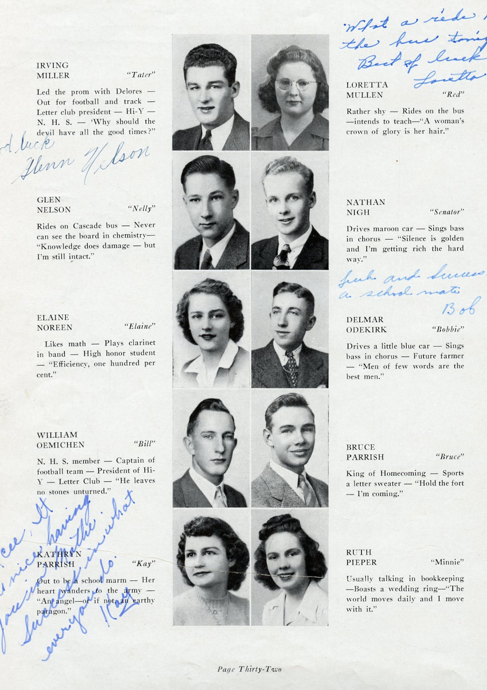 1944 Plymouth High School Page 32: Irving Miller, Loretta Mullen, Glen Nelson, Nathan Nigh, Elaine Noreen, Delmar Odekirk, William Oemichen, Bruce Parrish, Kathryn Parrish, Ruth Pieper.
