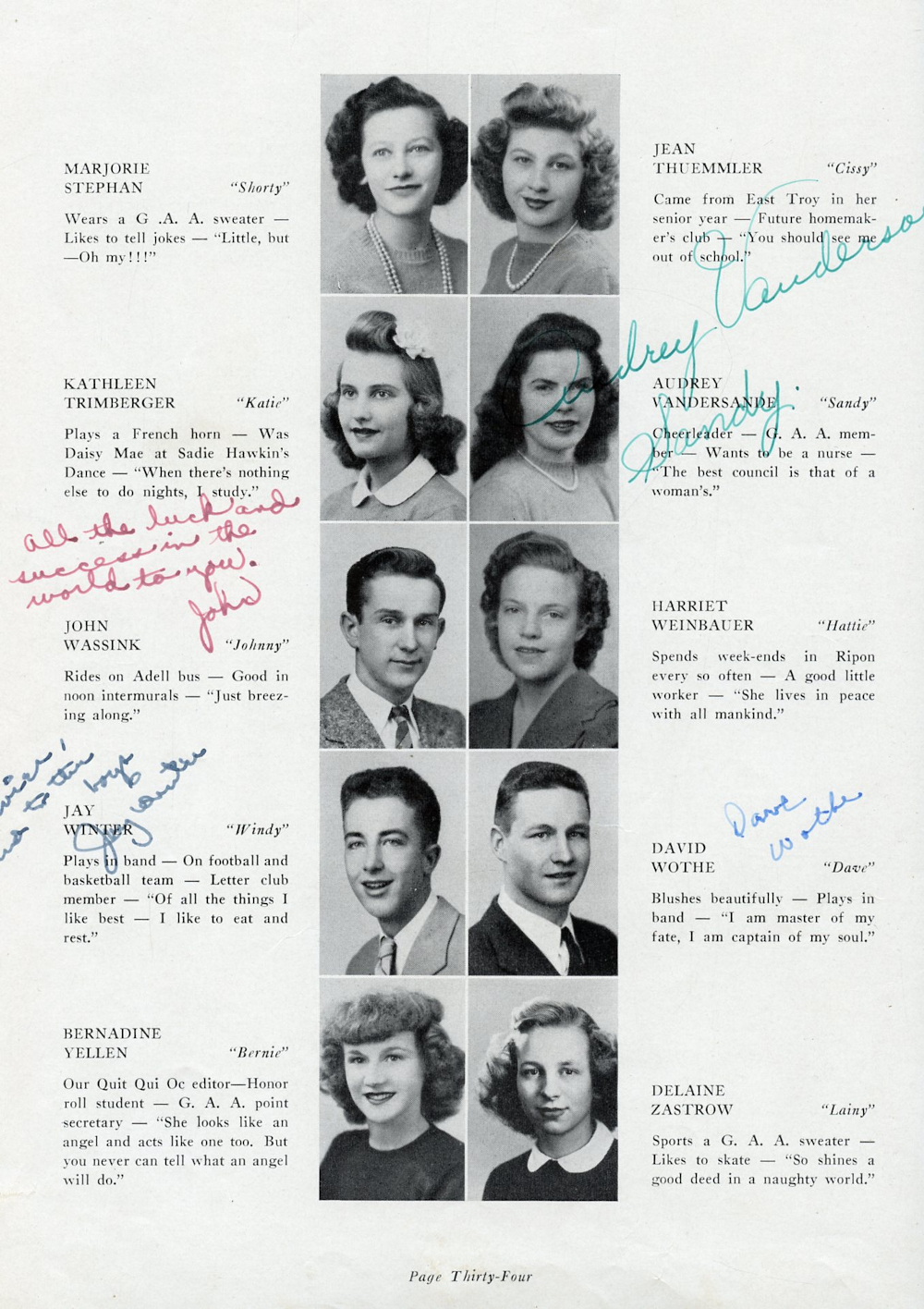 1944 Plymouth High School Page 34: Marjorie Stephan, Jean Thuemmler, Kathleen Trimberger, Audrey Vandersande, John Wassink, Harriet Weinbauer, Jay Winter, David Wothe, Bernadine Yellen, Delaine Zastrow.
