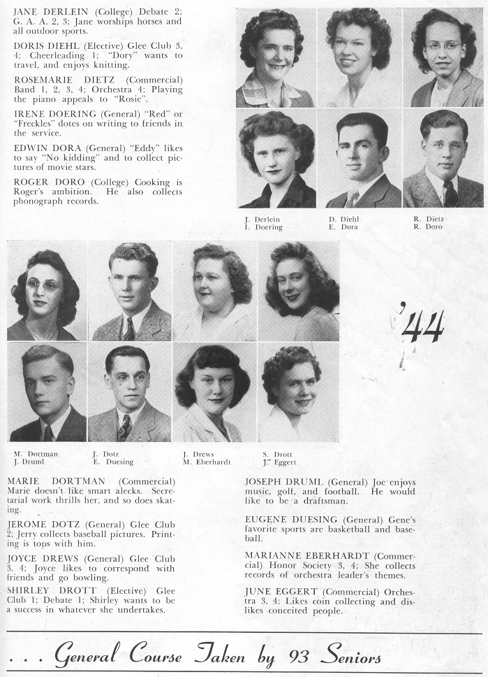 1944 Sheboygan Central High School, Page 35: Jane Derlein, Doris Diehl, Rosemarie Dietz, Irene Doering, Edwin Dora, Roger Doro, Marie Dortman, Jerome Dotz, Joyce Drews, Shirley Drott, Joseph Druml, Eugene Duesing, Marianne Eberhardt, June Eggert.