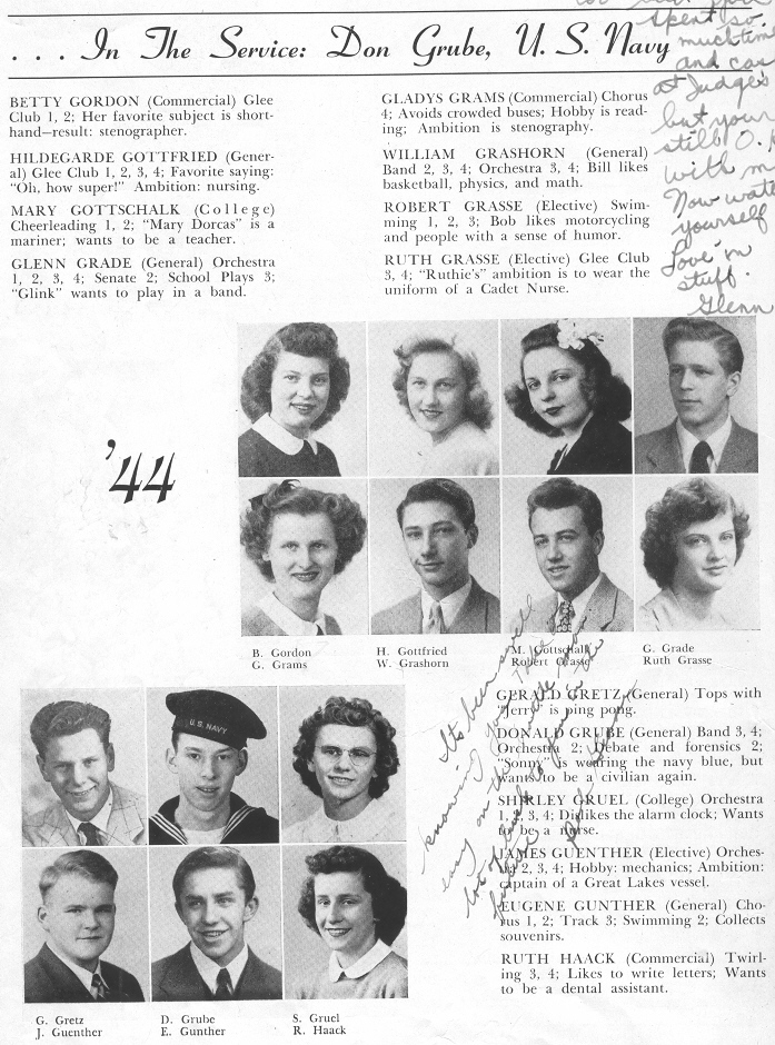 1944 Sheboygan Central High School, Page 38: Betty Gordon, Hildegarde Gottfried, Mary Gottschalk, Glenn Grade, Gladys Grams, William Grashorn, Robert Grasse, Ruth Grasse, Gerald Gretz, Donald Grube, Shirley Gruel, James Guenther, Eugene Gunther, Ruth Haack.
