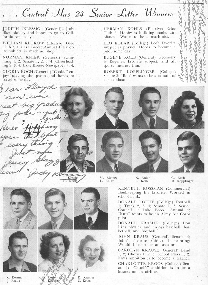 1944 Sheboygan Central High School, Page 42: Judith Klessig, William Klokow, Norman Knier, Gloria Koch, Herman Kohls, Leo Kolar, Eugene Kolb, Robert Kopplinger, Kenneth Kossman, Donald Kotte, Donald Kramer, John Kraus, Carolyn Krause, Charlotte Kroos.