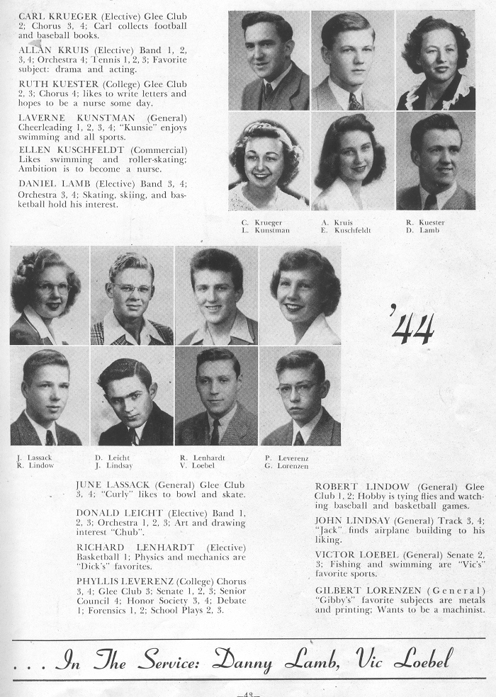 1944 Sheboygan Central High School, Page 43: Carl Krueger, Allan Kruis, Ruth Kuester, Laverne Kunstman, Ellen Kuschfeldt, Daniel Lamb, June Lassack, Donald Leicht, Richard Lenhardt, Phyllis Leverenz, Robert Lindow, John Lindsay, Victor Loebel, Gilbert Lorenzen.