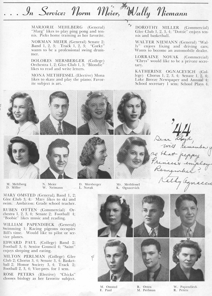 1944 Sheboygan Central High School, Page 45: Marjorie Mehlberg, Norman Meier, Dolores Mersberger, Mona Methfessel, Dorothy Miller, Walter Niemann, Lorraine Novak, Katherine Ognacevich, Mary Omsted, Ruben Otten, William Papendieck, Edward Paul, Milton Perlman, Rose Peters.