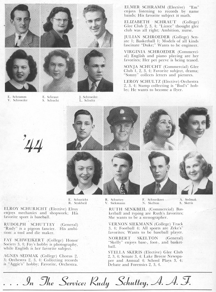 1944 Sheboygan Central High School, Page 48: Elmer Schramm, Elizabeth Schraut, Julian Schroeder, Virginia Schroeder, Sonja Schucht, Leroy Schultz, Elroy Schuricht, Rudolph Schuttey, Fay Schweikert, Agnes Sedmak, Ruth Senkbeil, Vernon Siekmann, Norbert Skelton, Stella Skeris.