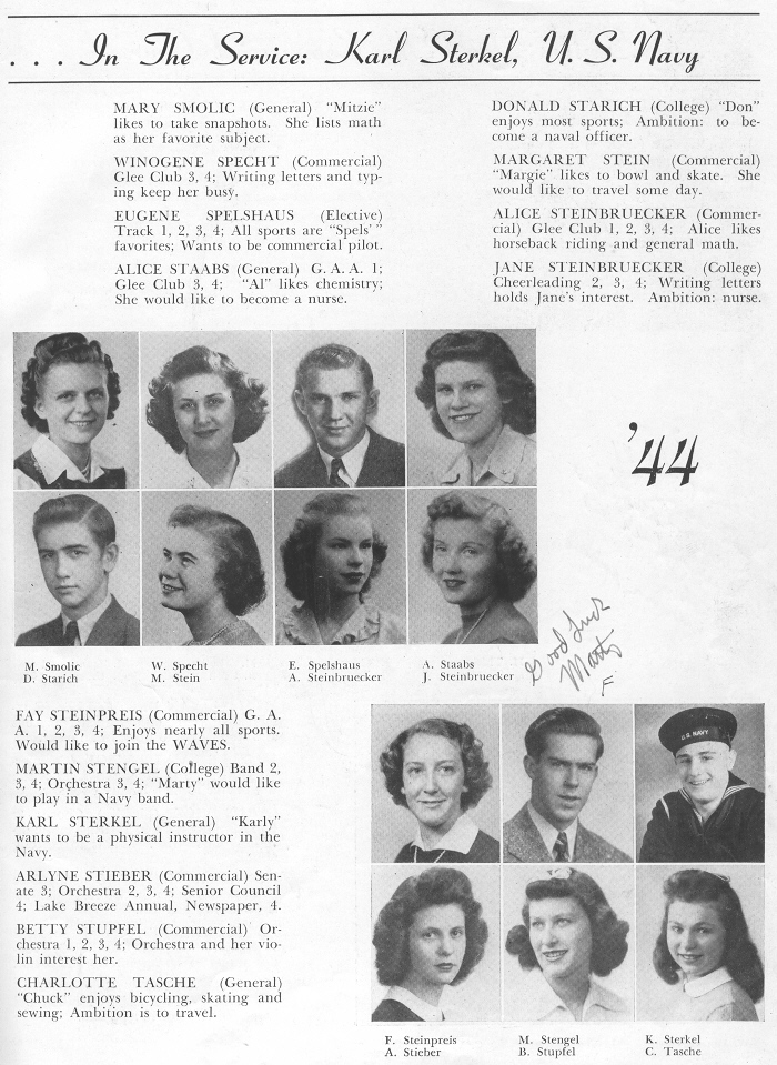 1944 Sheboygan Central High School, Page 49: Mary Smolic, Winogene Specht, Eugene Spelshaus, Alice Staabs, Donald Starich, Margaret Stein, Alice Steinbruecker, Jane Steinbruecker, Fay Steinpreis, Martin Stengel, Karl Sterkel, Arlyne Stieber, Betty Stupfel, Charlotte Tasche.