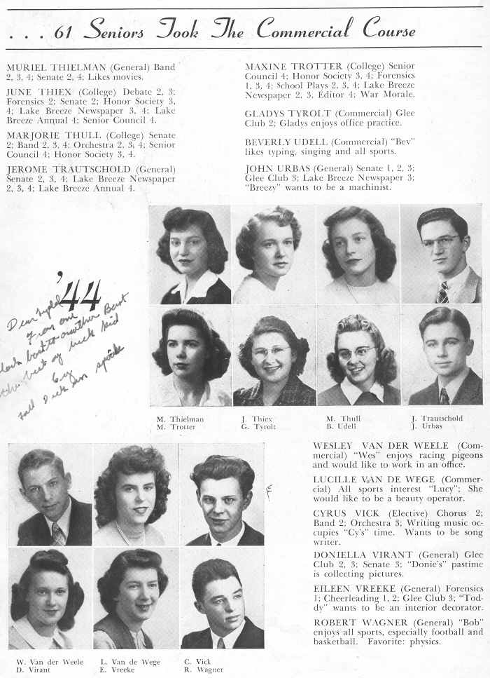 1944 Sheboygan Central High School, Page 50: Muriel Thielman, June Thiex, Marjorie Thull, Jerome Trautschold, Maxine Trotter, Gladys Tyrolt, Beverly Udell, John Urbas, Wesley Van Der Weele, Lucille Van de Wege, Cyrus Vick, Doniella Virant, Eileen Vreeke, Robert Wagner.