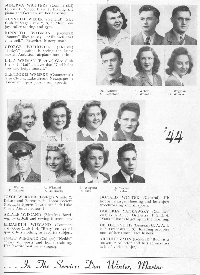 1944 Sheboygan Central High School, Page 51: Minerva Watters, Kenneth Weber, Kenneth Wegman, George Wehrwein, Lilly Weiman, Glendoris Weiseke, Joyce Werner, Arlyle Wiegand, Elizabeth Wiegand, Janet Wiegand, Donald Winter, Dolores Yankawsky, Delores Yutis, Arthur Zahn.