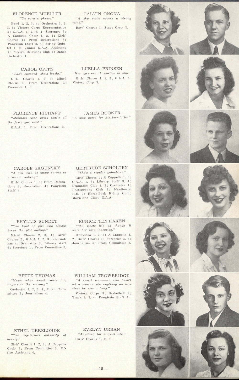 1944 Sheboygan Falls High School, Page 15: Florence Mueller, Calvin Ongna, Carol Opitz, Luella Prinsen, Florence Richart, James Rooker, Carole Sagunsky, Gertrude Scholten, Phyllis Sundet, Eunice Ten Haken, Bette Thomas, William Trowbridge, Ethel Ubbelohde, Evelyn Urban.