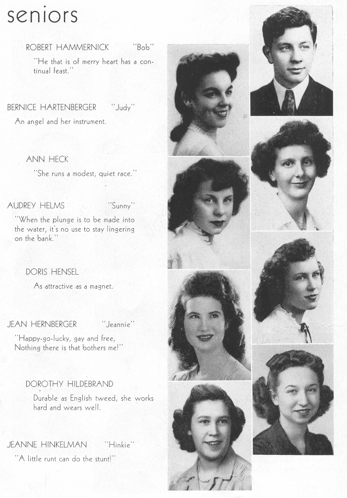 1944 Sheboygan North High School, Page 68: Robert Hammernick, Bernice Hartenberger, Ann Heck, Audrey Helms, Doris Hensel, Jean Hernberger, Dorothy Hildebrand, Jeanne Hinkelman.
