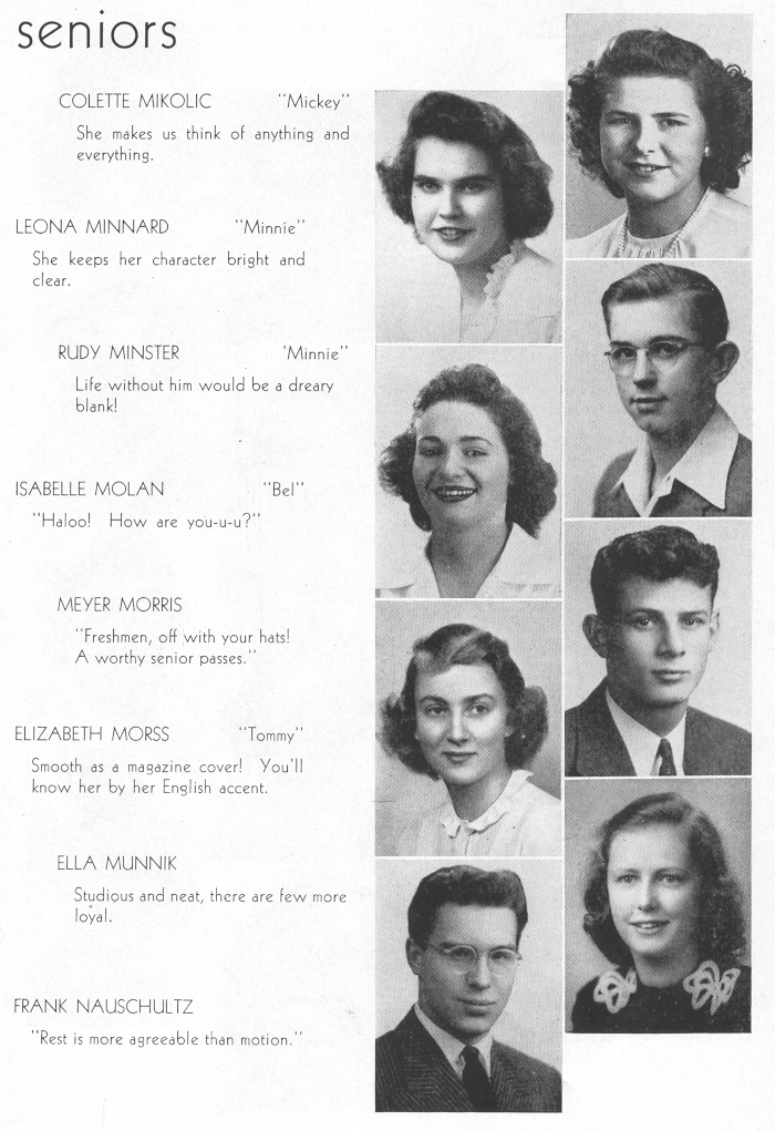 1944 Sheboygan North High School, Page 76: Colette Mikolic, Leona Minnard, Rudy Minster, Isabelle Molan, Meyer Morris, Elizabeth Morss, Ella Munnik, Frank Nauschultz.