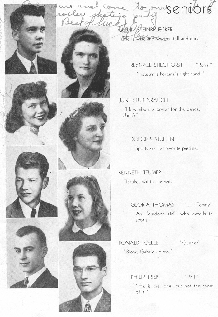 1944 Sheboygan North High School, Page 82: Glenn Steinbruecker, Reynale Stieghorst, June Stubenrauch, Dolores Stuefen, Kenneth Teumer, Gloria Thomas, Ronald Toelle, Philip Trier.