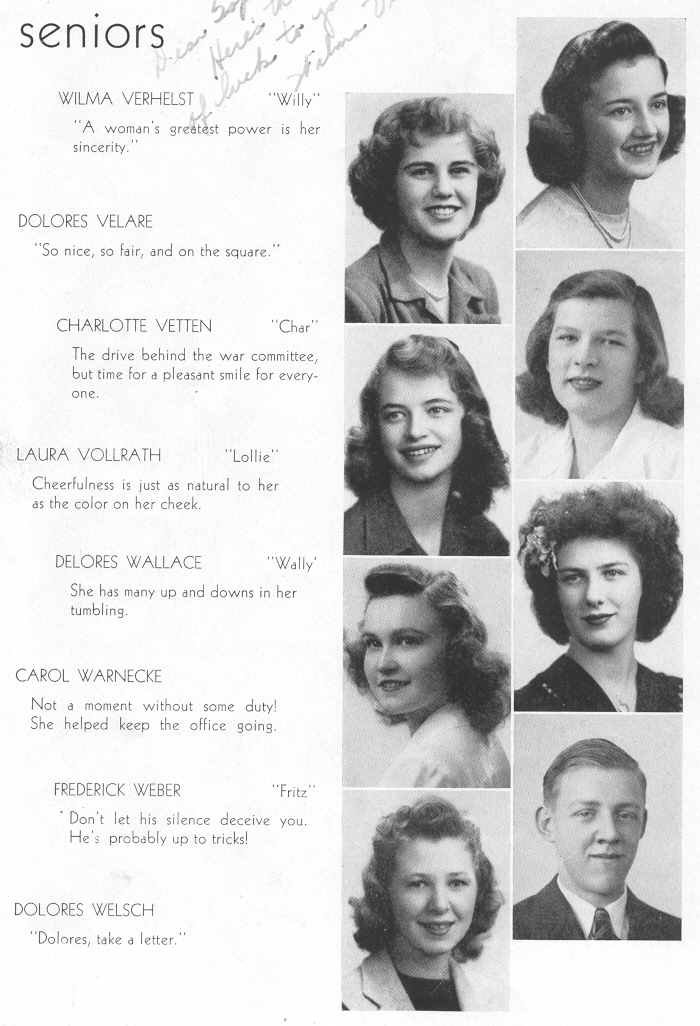 1944 Sheboygan North High School, Page 84: Wilma Verhelst, Dolores Velare, Charlotte Vetten, Laura Vollrath, Delores Wallace, Carol Warnecke, Frederick Weber, Dolores Welsch.