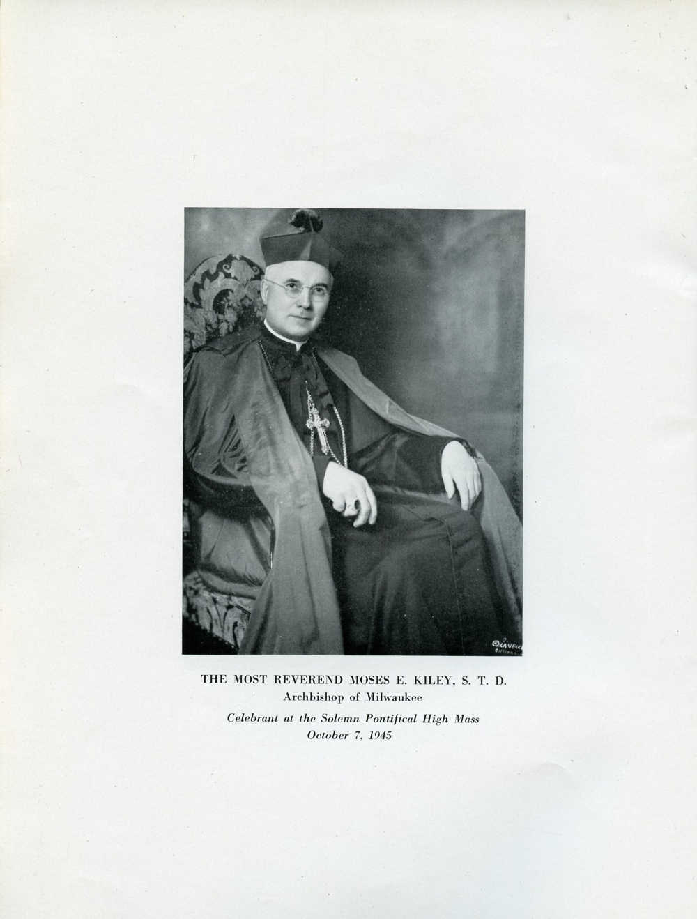 1945 Holy Name Church, Centennial Anniversary, 1845-1945, Sheboygan, Wisconsin, Page 10: The Most Reverend Moses E. Kiley, S. T. D., Archbishop of Milwaukee, Celebrant at the Solemn Pontifical High Mass, Ocober 7, 1945.