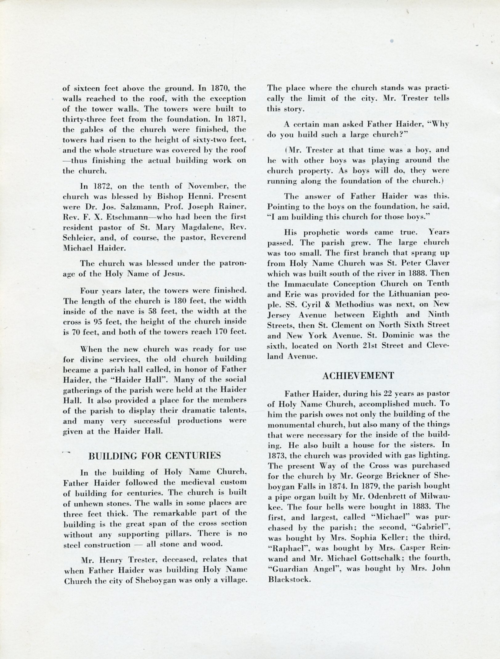 1945 Holy Name Church, Centennial Anniversary, 1845-1945, Sheboygan, Wisconsin, Page 16: The Chronicle, Building for Centuries, Achievement.