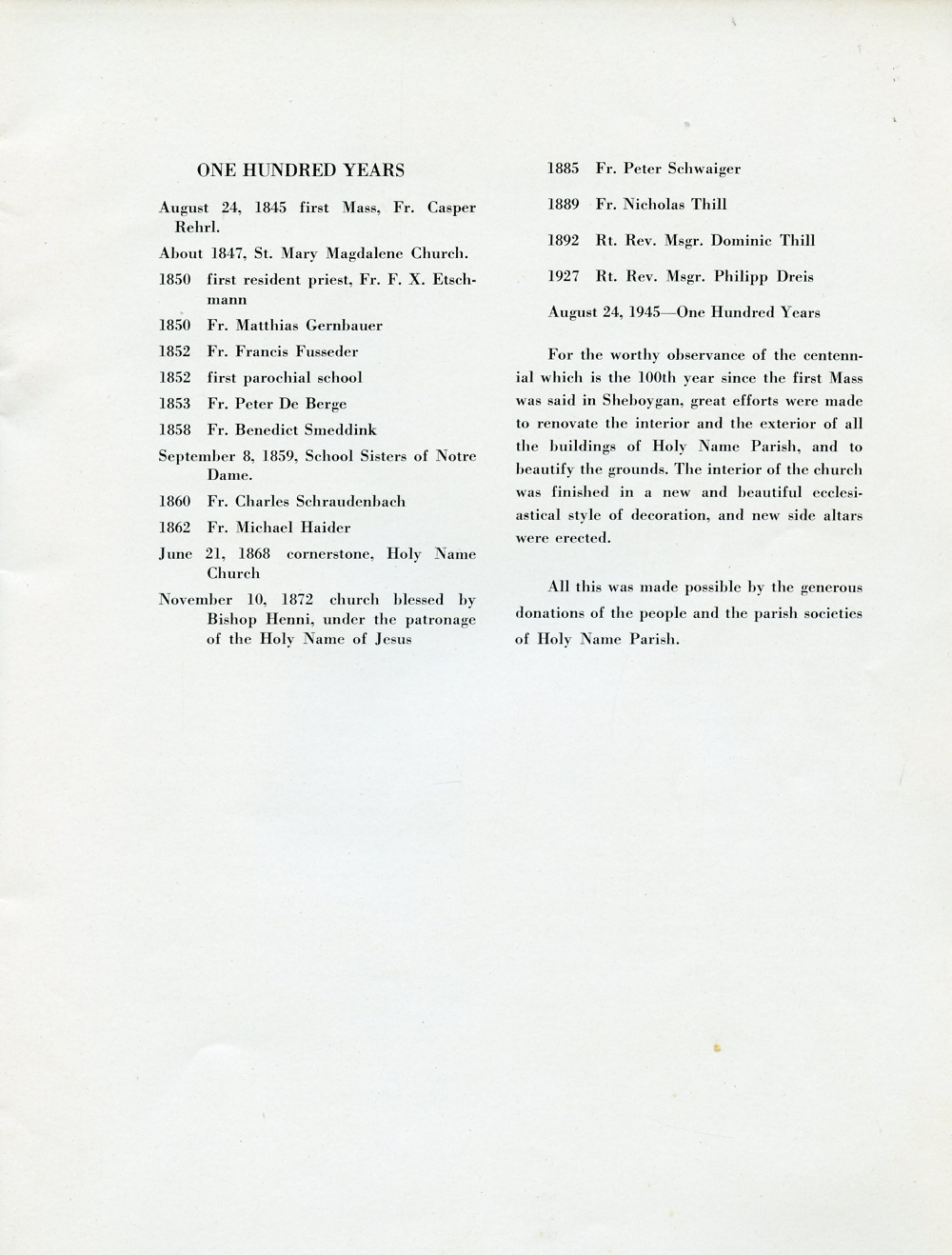 1945 Holy Name Church, Centennial Anniversary, 1845-1945, Sheboygan, Wisconsin, Page 19: The Chronicle, One Hundred Years.