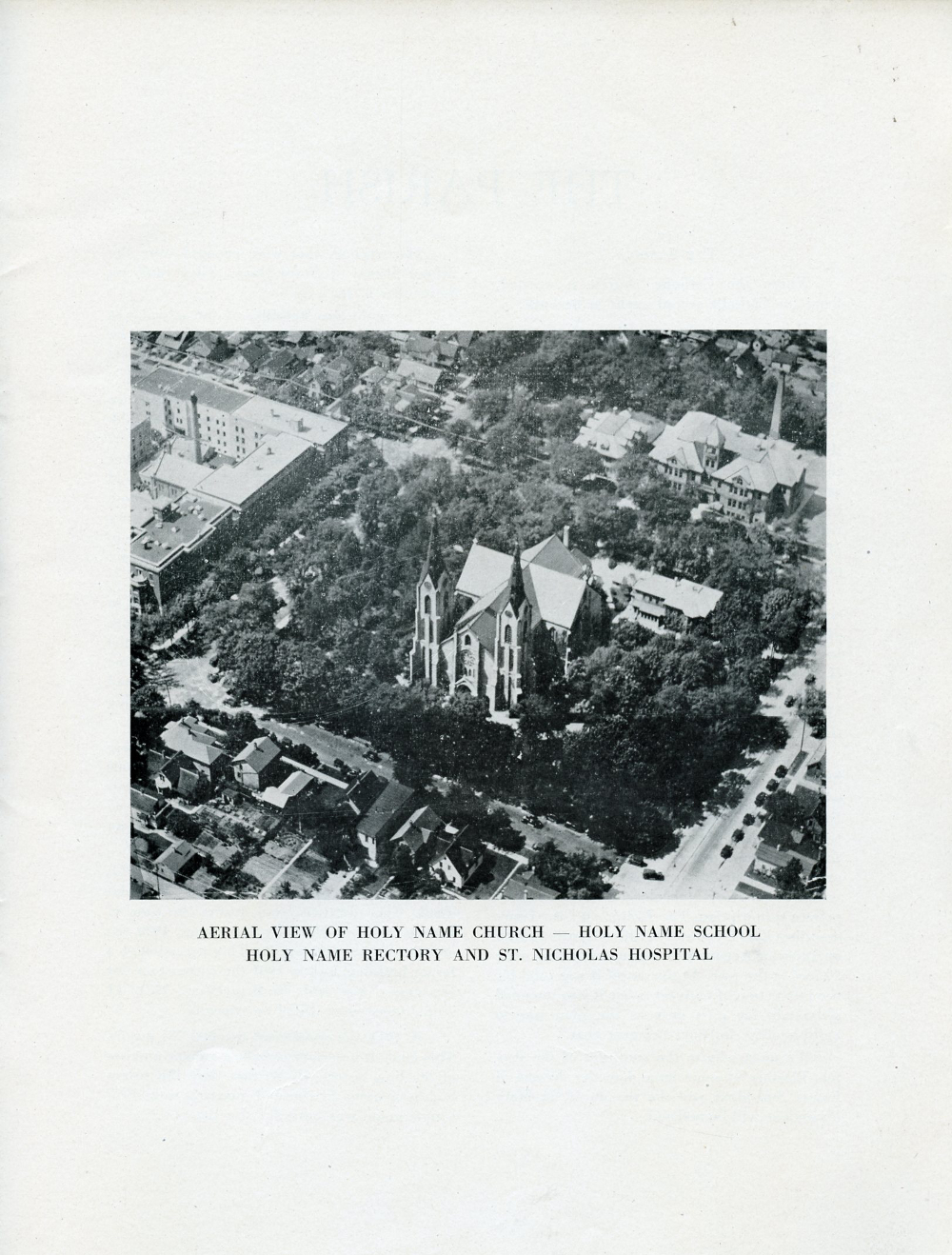 1945 Holy Name Church, Centennial Anniversary, 1845-1945, Sheboygan, Wisconsin, Page 35: Aerial View of Holy Name Church -- Holy Name School, Holy Name Rectory and St. Nicholas Hospital.