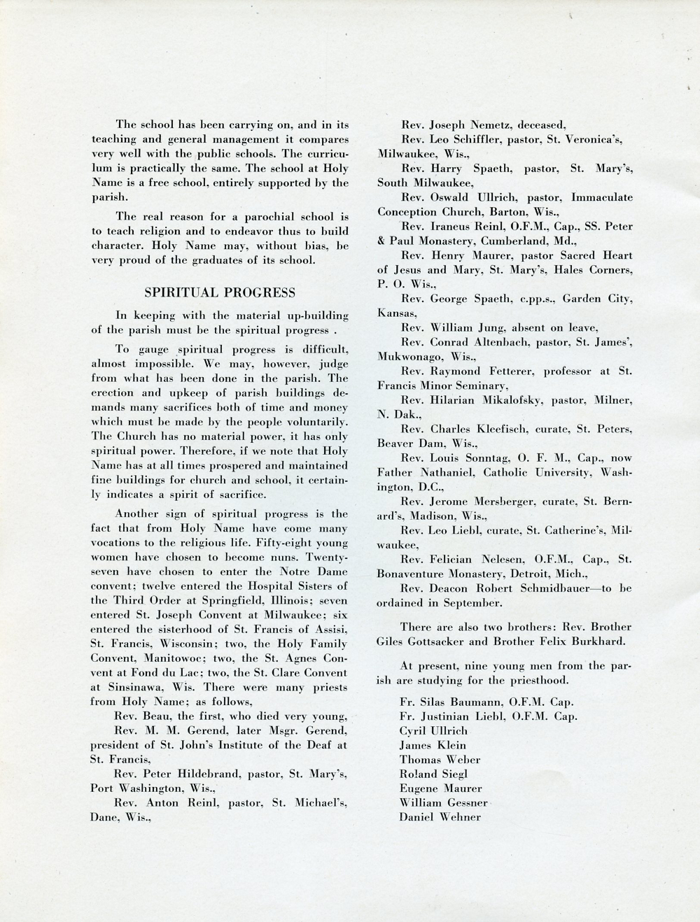 1945 Holy Name Church, Centennial Anniversary, 1845-1945, Sheboygan, Wisconsin, Page 38: The Parish -- Spiritual Progress.