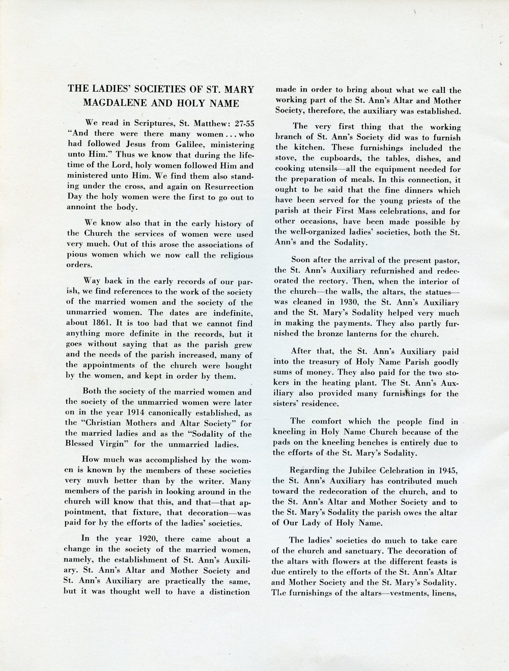 1945 Holy Name Church, Centennial Anniversary, 1845-1945, Sheboygan, Wisconsin, Page 40: The Ladies' Societies of St. Mary Magdalene and Holy Name.