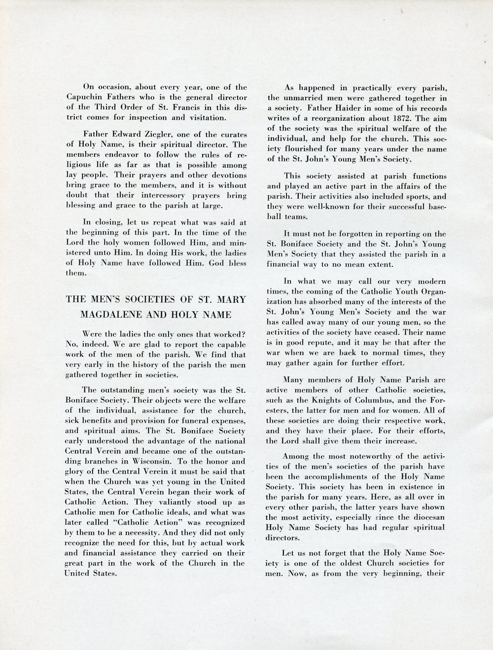 1945 Holy Name Church, Centennial Anniversary, 1845-1945, Sheboygan, Wisconsin, Page 42: The Men's Societies of St. Mary Magdalene and Holy Name.