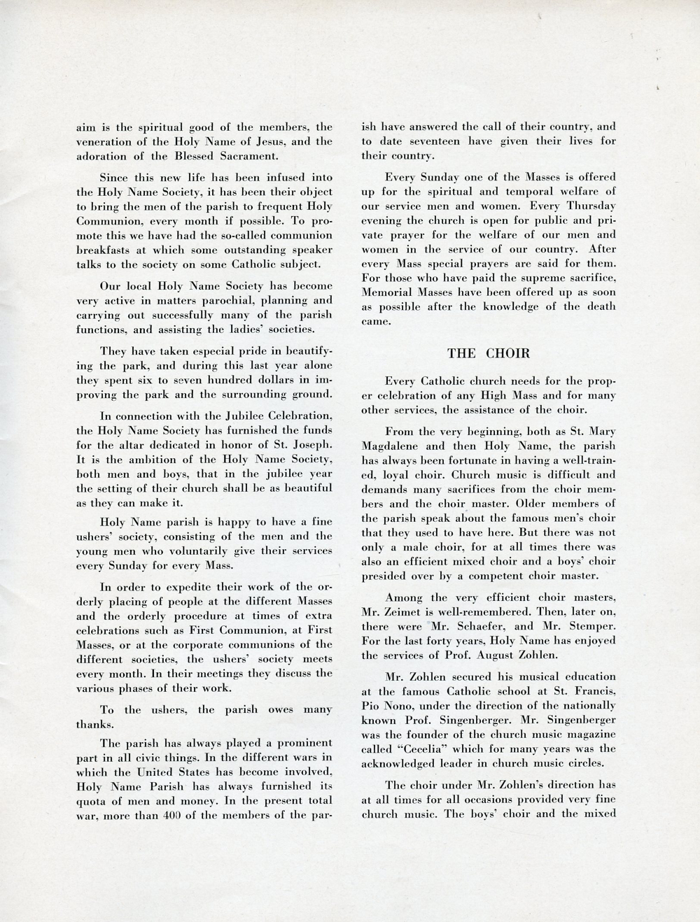 1945 Holy Name Church, Centennial Anniversary, 1845-1945, Sheboygan, Wisconsin, Page 43: The Choir.