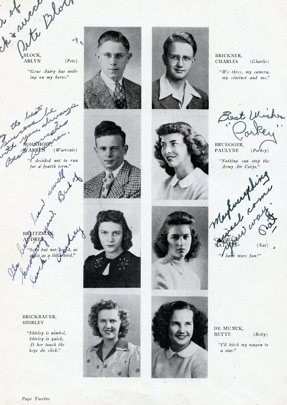 1945 Plymouth High School Yearbook Page 12: Arlyn Block, Warren Bohnhoff, Audrey Breitzman, Shirley Brickbauer, Charles Brickner, Paulyne Bruegger, Natalie Carolla, Bette De Munck.