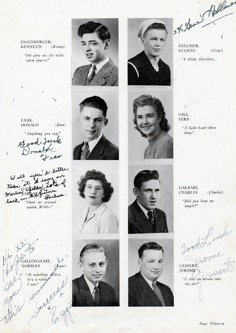1945 Plymouth High School Yearbook Page 13: Kenneth Eigenberger, Donald Faas, Barbara Galloway, Norman Gillingham, Eugene Hellmer, Fern Gill, Charles Galbari, Jerome Gessert.