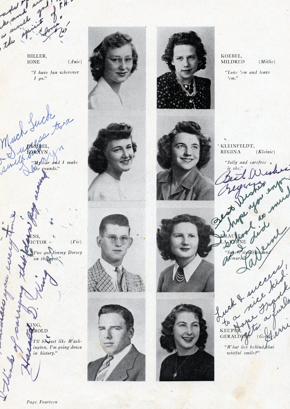 1945 Plymouth High School Yearbook Page 14: Ione Hiller, Lorayn Hembel, Victor Jens, Harold King, Mildred Koebel, Regina Kleinfeldt, La Verne Krause, Geraldine Keuper.