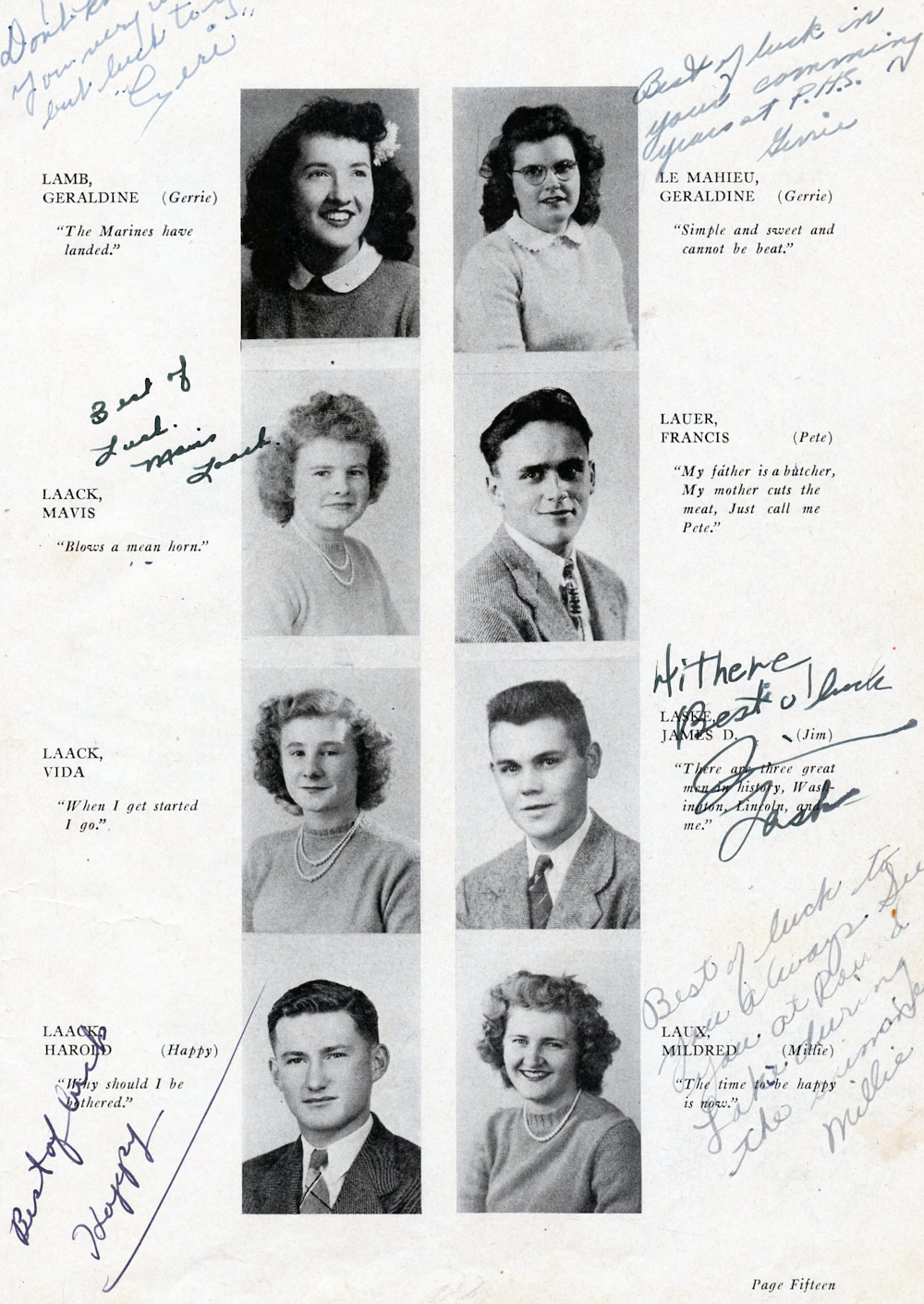 1945 Plymouth High School Yearbook Page 15: Geraldine Lamb, Mavis Laack, Vida Laack, Harold Laack, Geraldine Le Mahieu, Francis Lauer, James D. Laske, Mildred Laun.