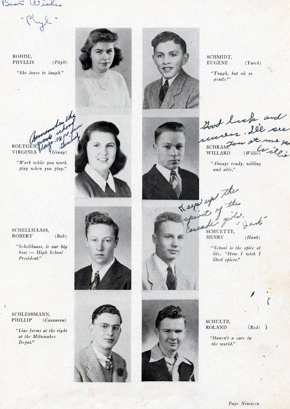 1945 Plymouth High School Yearbook Page 19: Phyllis Rohde, Virginia Roltgen, Robert Schellhaass, Phillip Schlessmann, Eugene Schmidt, William Schram, Henry Schuette, Roland Schultz.