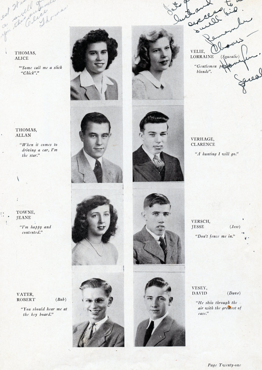 1945 Plymouth High School Yearbook Page 21: Alice Thomas, Allan Thomas, Jeane Towne, Robert Vater, Lorraine Velie, Clarence Verhage, Jesse Versch, David Vesey.