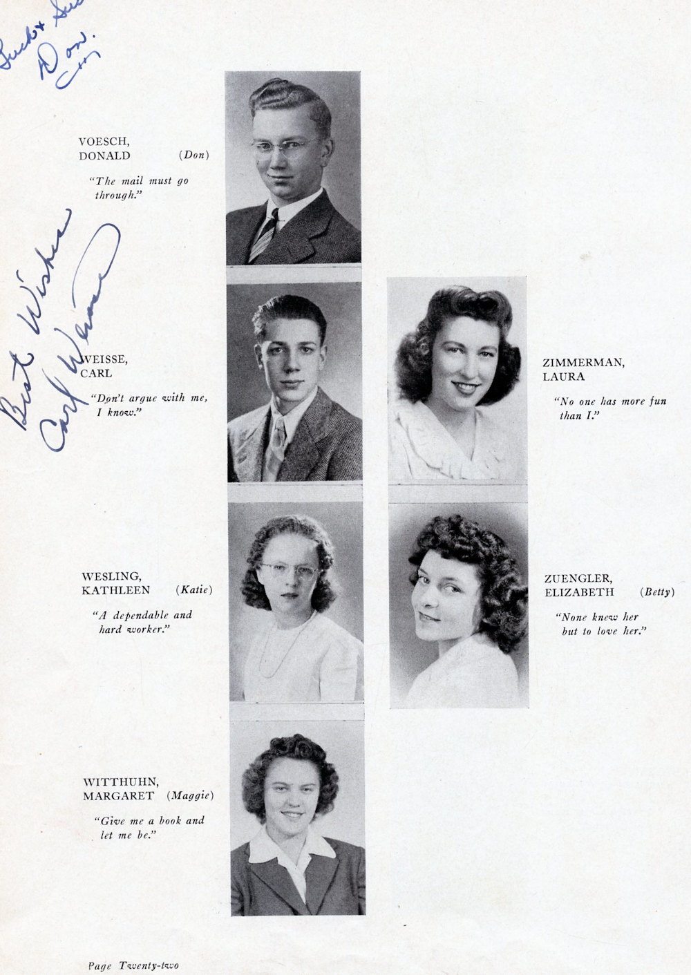 1945 Plymouth High School Yearbook Page 22: Donald Voesch, Carl Weisse, Kathleen Wesling, Margaret Witthuhn, Laura Zimmerman, Elizabeth Zuengler.