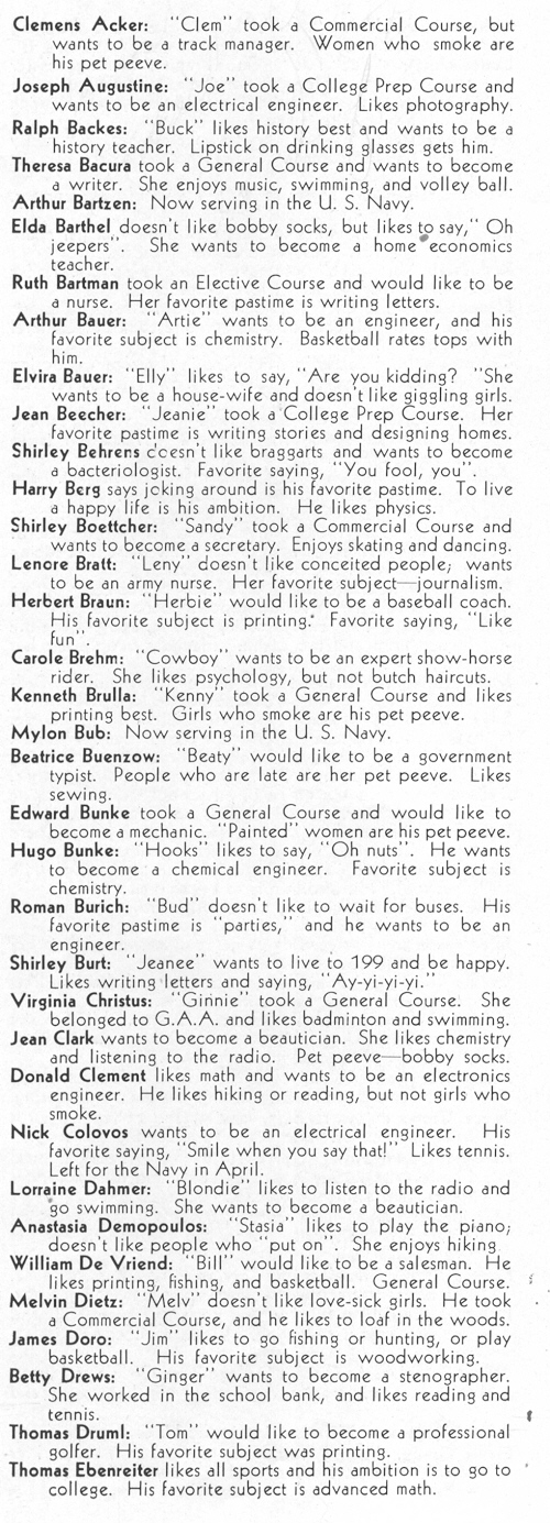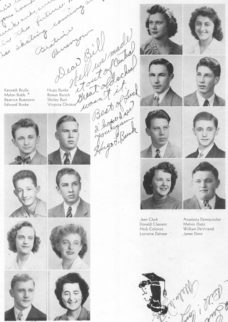 1945 Sheboygan Central High School, Pages 33 and 49: Kenneth Brulla, Mylon Bubb, Beatrice Buenzow, Edward Bunke, Hugo Bunke, Roman Burich, Shirley Burt, Virginia Christus, Jean Clark, Donald Clement, Nick Colovos, Lorraine Dahmer, Anastasia Demopoulos, Melvin Dietz, William DeVriend, James Doro.