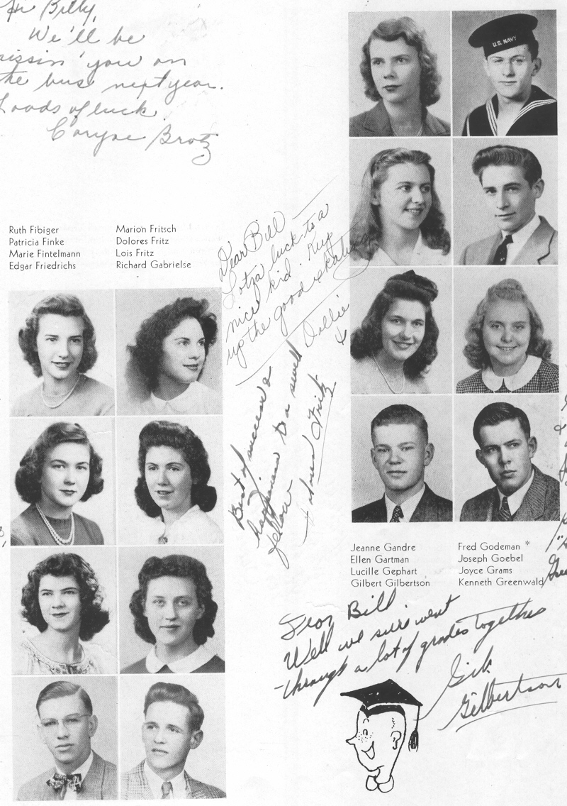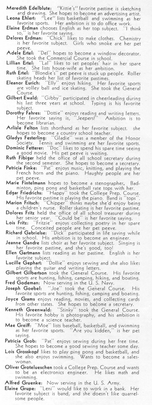 1945 Sheboygan Central High School, Pages 35 and 50: Ruth Fibiger, Patricia Finke, Marie Fintelmann, Edgar Friedrichs, Marion Fritsch, Dolores Fritz, Lois Fritz, Richard Gabrielse, Jeanne Gandre, Ellen Gartman, Lucille Gephart, Gilbert Gilbertson, Fred Godeman, Joseph Goebel, Joyce Grams, Kenneth Greenwald.