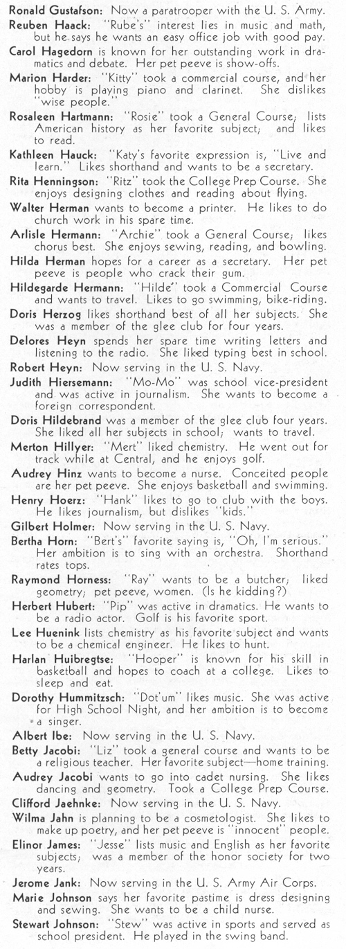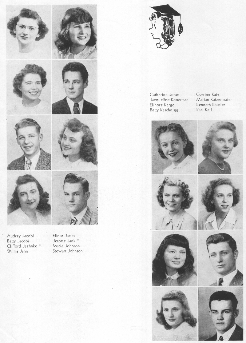 1945 Sheboygan Central High School, Pages 38, 51 and 52: Audrey Jacobi, Betty Jacobi, Cliffornd Jaehnke, Wilma Jahn, Elinor James, Jerome Jank, Marie Johnson, Stewart Johnson, Catherine Jones, Jacqueline Kamerman, Elinore Karge, Betty Kaschnigg, Corrine Kate, Marian Katzenmaier, Kenneth Kausler, Karl Keil.