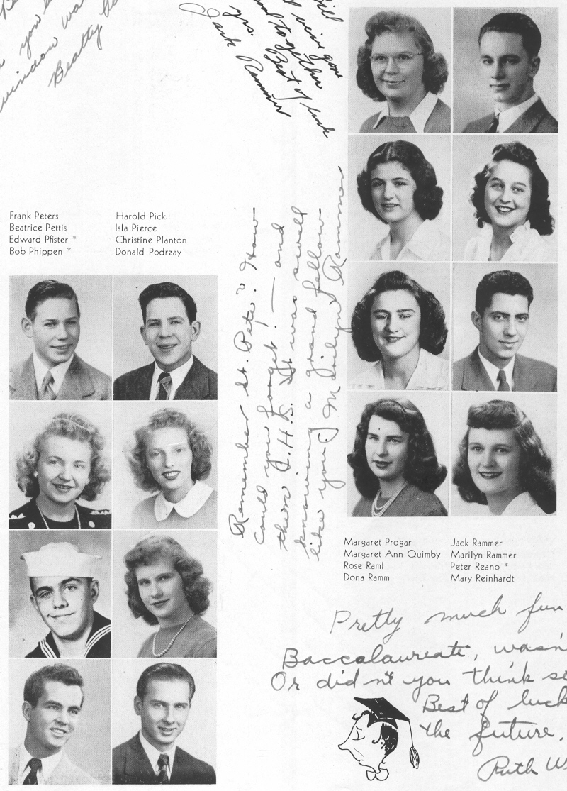 1945 Sheboygan Central High School, Pages 43 and 54: Frank Peters, Beatrice Pettis, Edward Pfister, Bob Phippen, Harold Pick, Isla Pierce, Christine Planton, Donald Podrzay, Margaret Progar, Margaret Quimby, Rose Raml, Dona Ramm, Jack Rammer, Marilyn Rammer, Peter Reano, Mary Reinhardt.