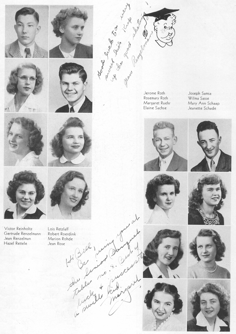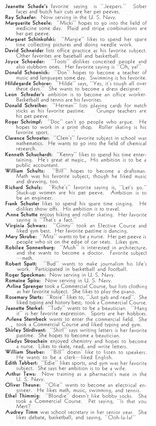 1945 Sheboygan Central High School, Pages 44, 54 and 55: Victor Reinholtz, Gertrude Renzelmann, Jean Renzelman, Hazel Rettele, Lois Retzlaff, Robert Roerdink, Marion Rohde, Jean Rose, Jerome Roth, Rosemary Roth, Margaret Ruehr, Elaine Sachse, Joseph Samsa, Wilma Sasse, Mary Schaap, Jeanette Schade.
