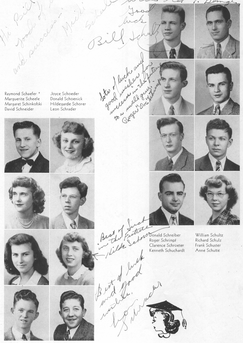 1945 Sheboygan Central High School, Pages 45 and 55: Raymond Schaefer, Marguerite Scheele, Margaret Schinkofski, David Schneider, Joyce Schoeder, Donald Schoenick, Hildegarde Schorer, Leon Schrader, Donald Schreiber, Roger Schrimpf, Clarence Schroeter, Kenneth Schuchardt, William Schultz, Richard Schulz, Frank Schuster, Anne Schutte.