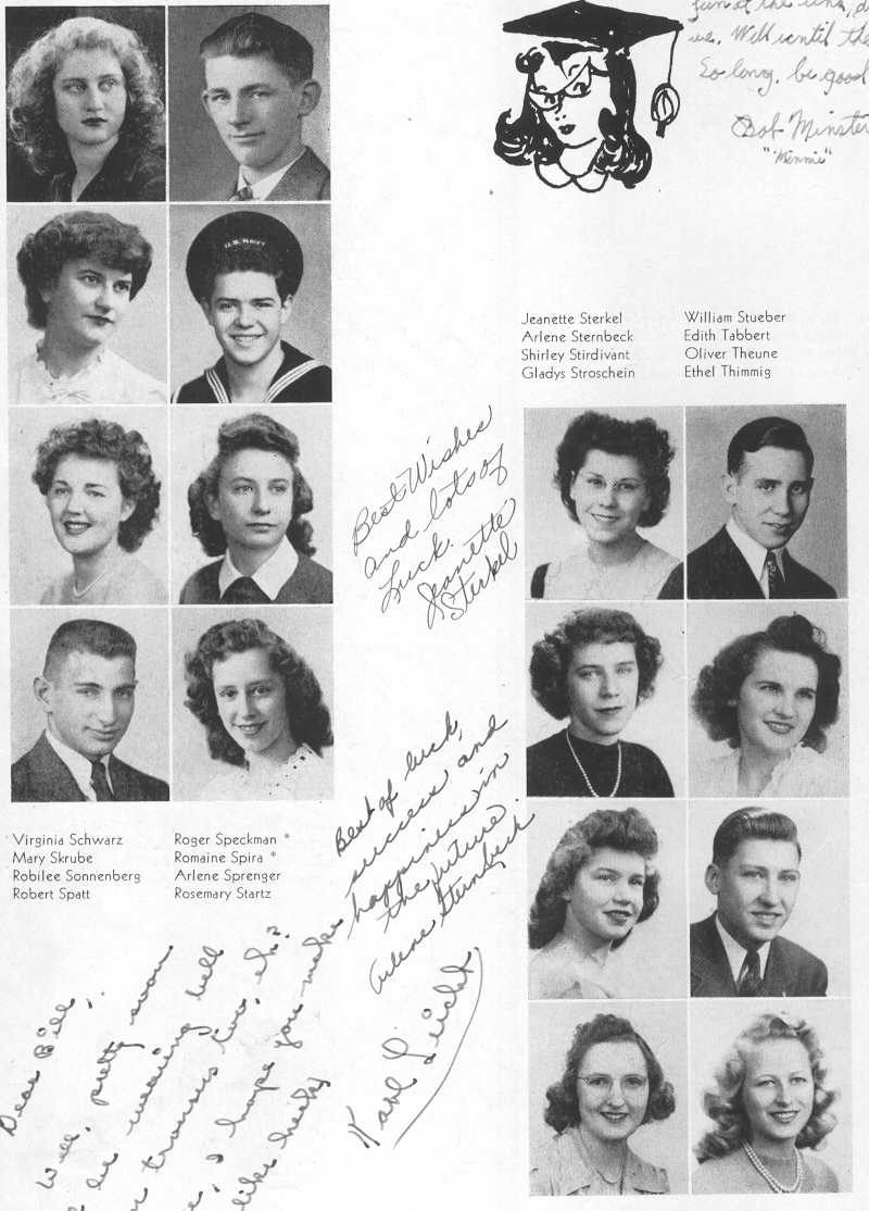 1945 Sheboygan Central High School, Pages 46 and 55: Virginia Schwatz, Mary Skrube, Robilee Sonnenberg, Robert Spatt, Roger Speckman, Arlene Sprenger, Rosemary Startz, Jeanette Sterkel, Arlene Sternbeck, Shirley Stirdivant, Gladys Stroschein, William Stueber, Edith Tabbert, Oliver Theune, Ethel Thimmig.