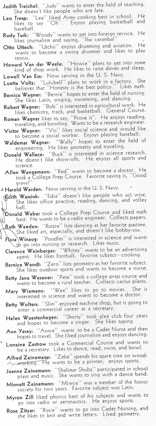 1945 Sheboygan Central High School, Pages 48, 50, 52, 53, 55 and 56: Edith Wassink, Donald Weber, Ruth Weeden, Flora Weinaug, Clarence Weinberger, Bernice Wendt, Betty Wesener, Mary Wiemann, Betty Wolders, Helen Wuestenhagen, Ann Yeray, Lorraine Zastrow, Alfred Zeinemann, Jeanne Zeinemann, Minnett Zeinemann, Mylon Zill, Rose Zitzer, Robert Kovacic, Harold Neese, Sara Mallin.