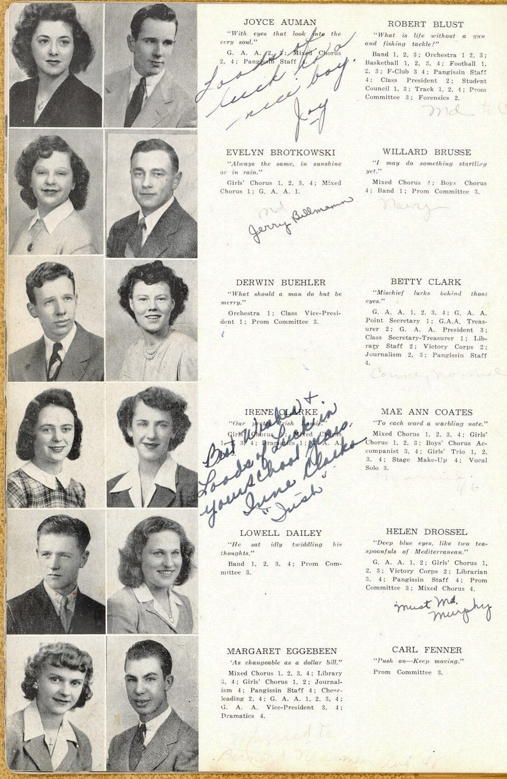 1945 Sheboygan Falls High School, Page 14: Joyce Auman, Robert Blust, Evelyn Brotkowski, Willard Brusse, Derwin Buehler, Betty Clark, Irene Clarke, Mae Ann Coates, Lowell Dailey, Helen Drossel, Margaret Eggebeen, Carl Fenner.