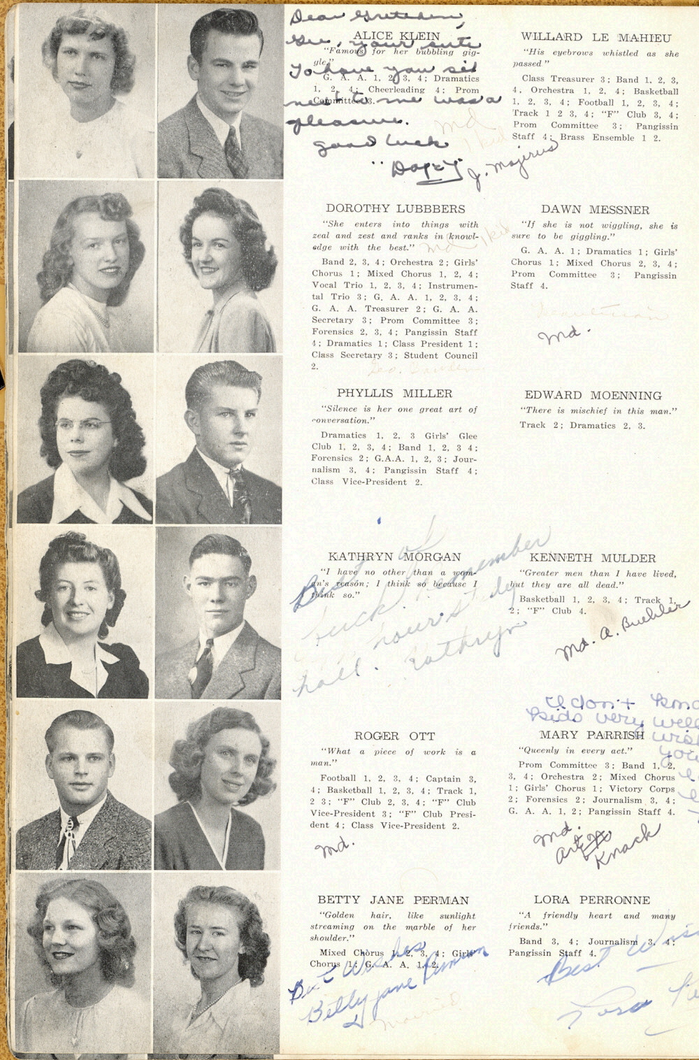 1945 Sheboygan Falls High School, Page 16: Alice Klein, Willard Le Mahieu, Dorothy Lubbers, Dawn Messner, Phyllis Miller, Edward Moenning, Kathryn Morgan, Kenneth Mulder, Roger Ott, Mary Parrish, Betty Jane Perman, Lora Perronne.