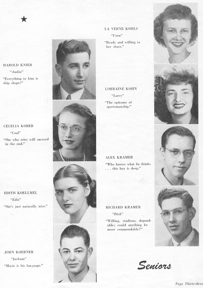 1945 Sheboygan North High School, Page 33: Harold Knier, Cecelia Kober, Edith Koellmel, John Koerner, La Verne Kohls, Lorraine Kohn, Alex Kramer, Richard Kramer.