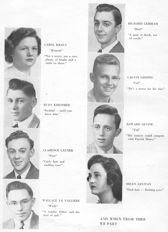 1945 Sheboygan North High School, Page 34: Carol Kraus, Rudy Kressmer, Clarence Launer, Wallace La Valliere, Richard Leibham, Calvin Leiding, Edward Leving, Helen Levitan.