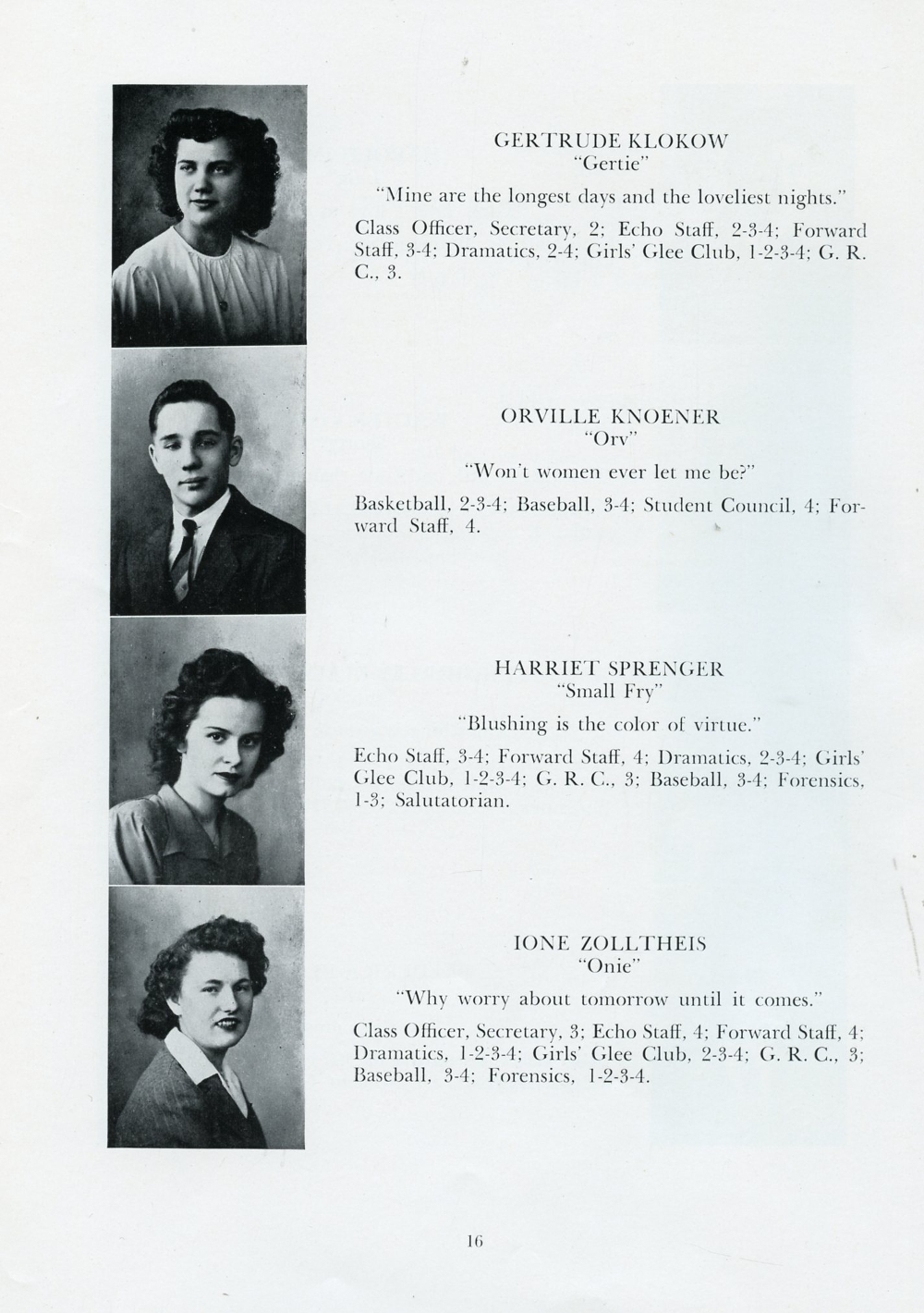 1946 Howards Grove High School, Page 16: Gertrude Klokow, Orville Knoener, Harriet Sprenger, Ione Zolltheis.