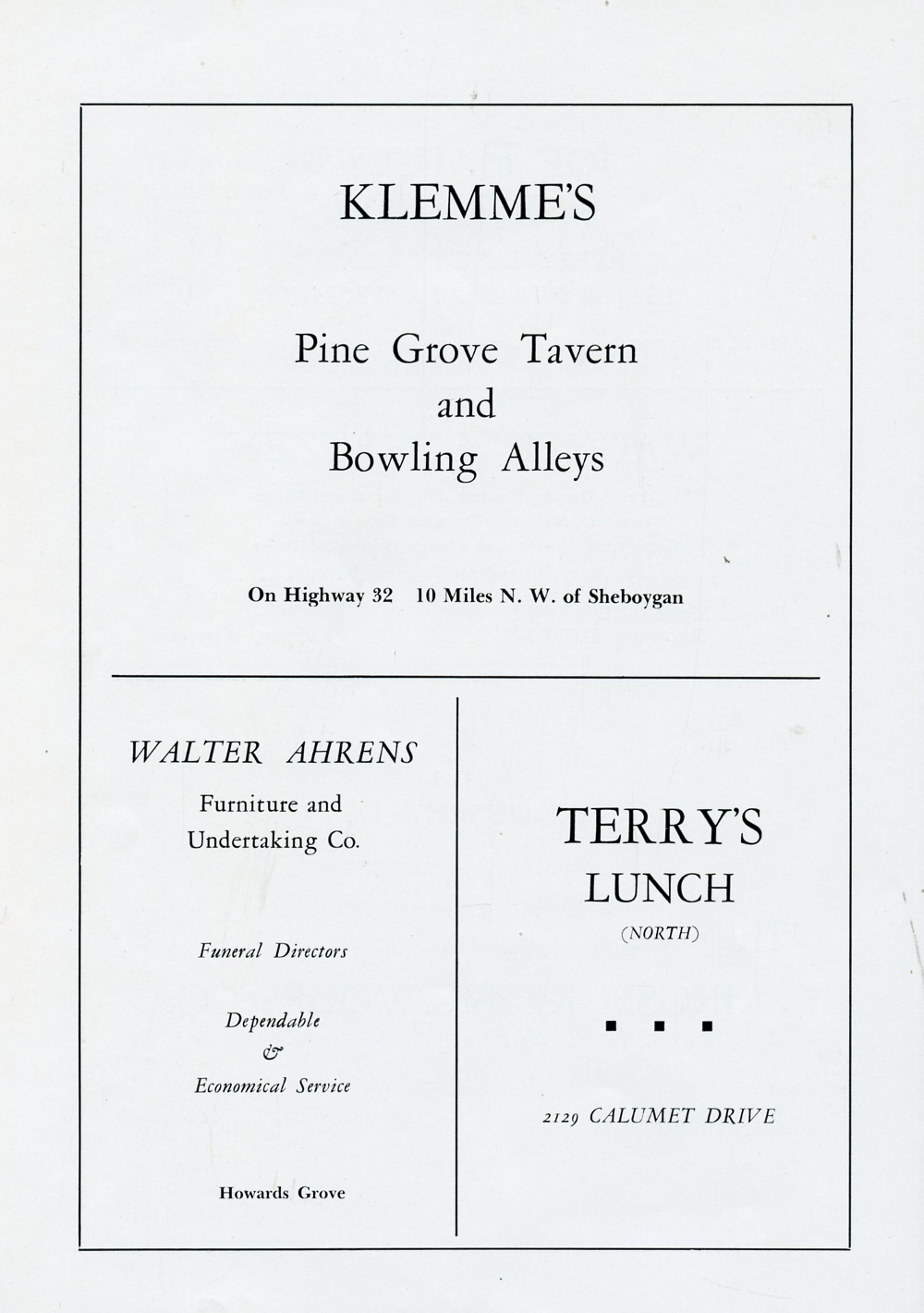 1946 Howards Grove Senior Class Yearbook, Page 60: Klemme's, Walter Ahrens, Terry's Lunch.