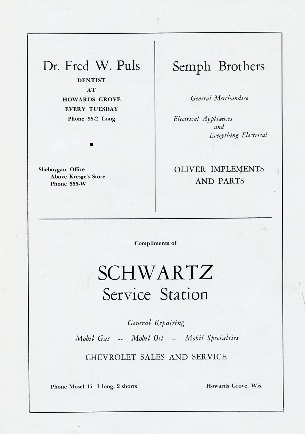 1946 Howards Grove Senior Class Yearbook, Page 62: Dr. Fred W. Puls, Semph Brothers, Schwartz Service Station.