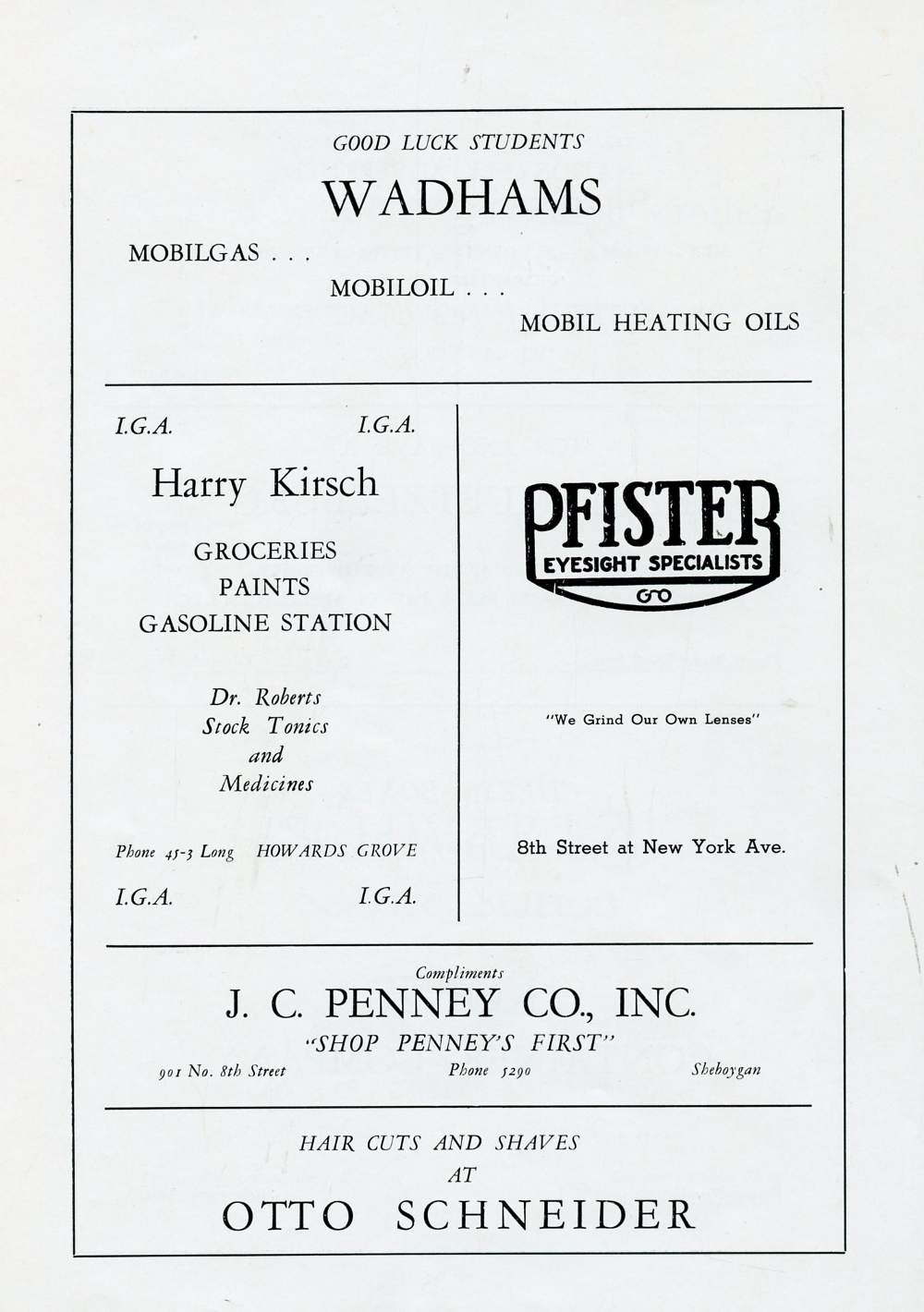 1946 Howards Grove Senior Class Yearbook, Page 64: Wadhams, Harry Kirsch, Pfister, J. C. Penney, Otto Schneider.