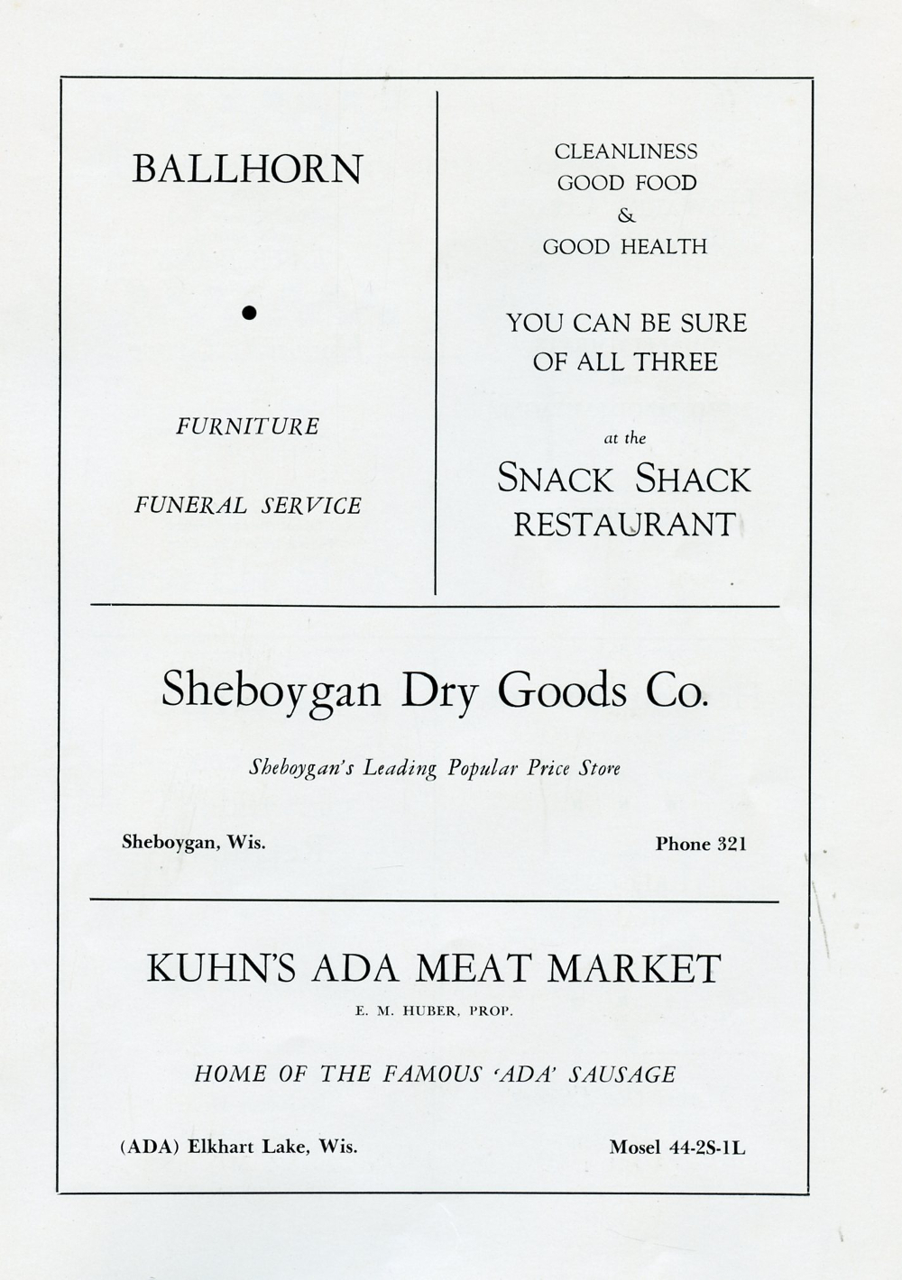 1946 Howards Grove Senior Class Yearbook, Page 65: Ballhorn, Snack Shack Restaurant, Sheboygan Dry Goods Co., Kuhn's Ada Meat Market.