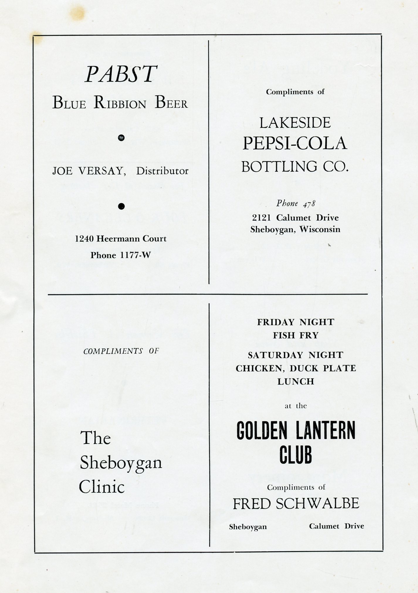 1946 Howards Grove Senior Class Yearbook, Page 70: Pabst Blue Ribbon Beer, Lakeside Pepsi-Cola Bottling Co., The Sheboygan Clinic, Golden Lantern Club.