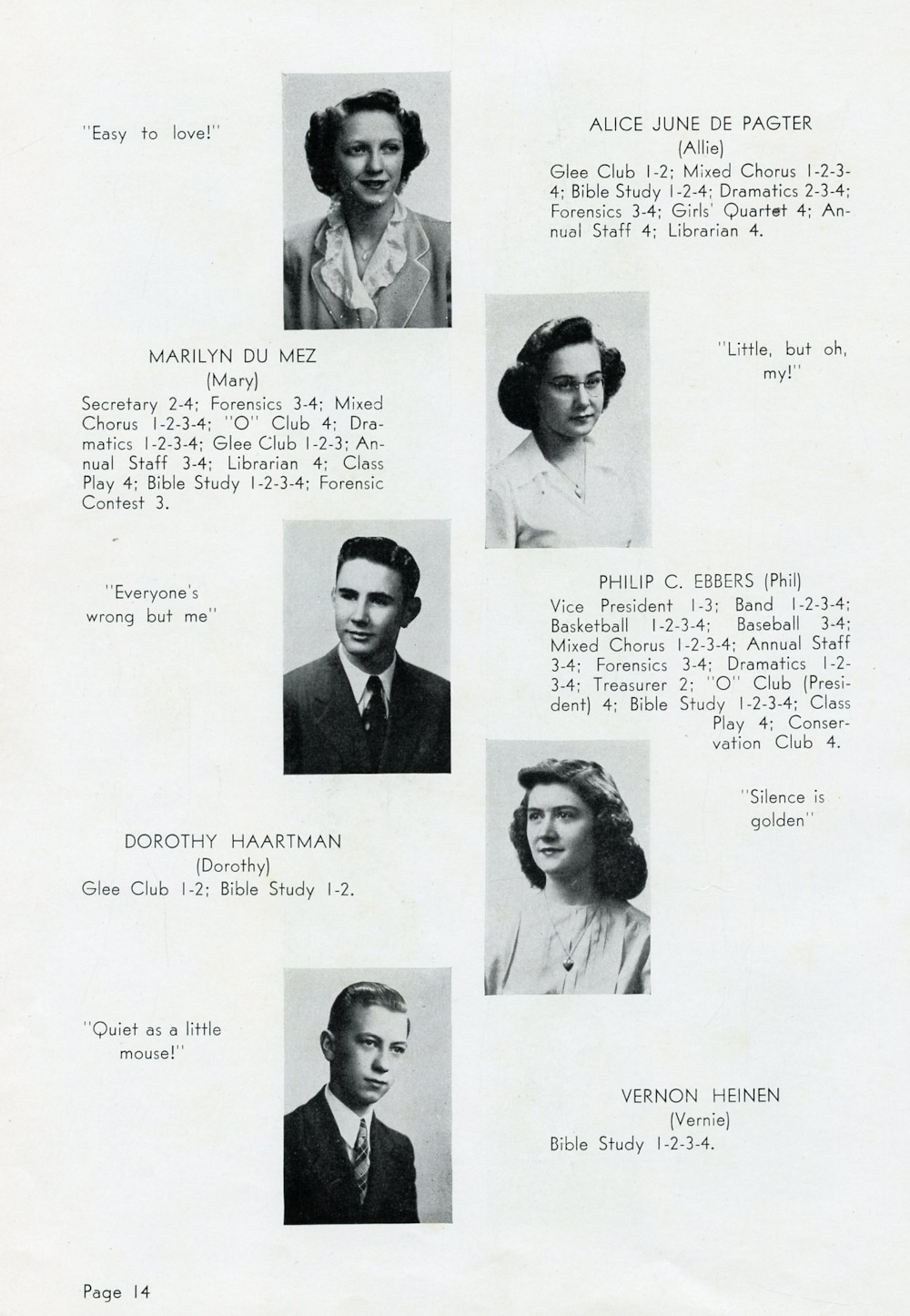 1946 Oostburg High School Page 14: Alice June De Pagter, Marilyn Du Mez, Philip C. Ebbers, Dorothy Haartman, Vernon Heinen.